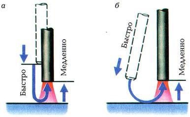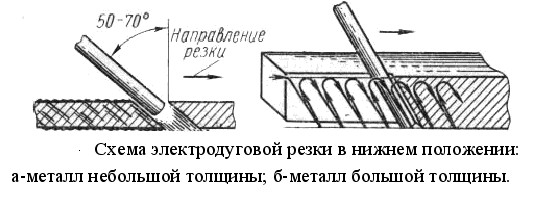 После зажигания дуги, электрод наклонить в сторону противоположную направлению резки (углом вперед). Электрическую дугу зажигают у начала реза на верхней кромке и в процессе резки перемещают ее вниз вдоль разрезаемой кромки. При горении электрода разрезаемый металл расплавляется и выдувается из зоны резки газами, образующимися при горении электрода. Совершая возвратно поступательные движения электродом сверху вниз, сдуваем расплавленный металл из зоны реза. Образующийся в процессе резки шлак и газы защищают расплавленный металл от окисления и науглероживания.